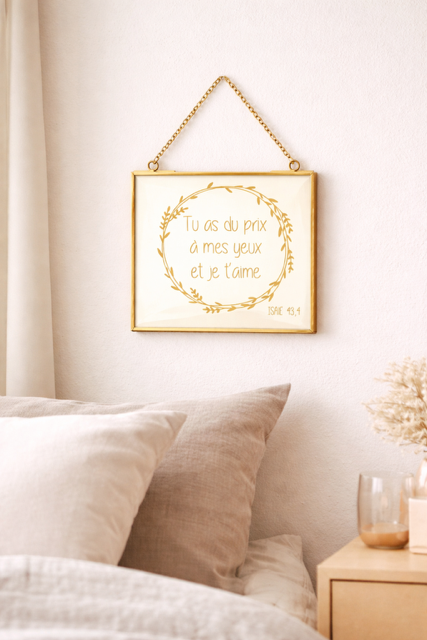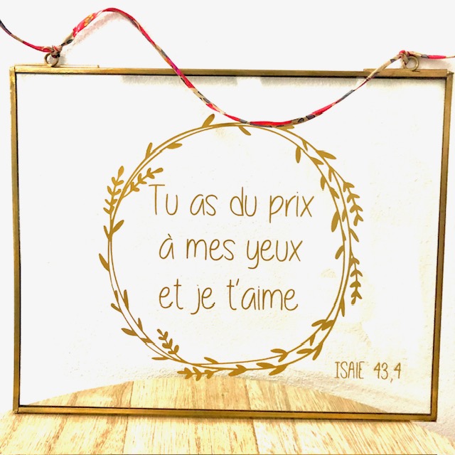 Apportez une touche de douceur et de spiritualité à votre intérieur avec ce cadre délicat inspiré du verset d’Isaïe: » Tu as de la valeur à mes yeux et je t’aime ».